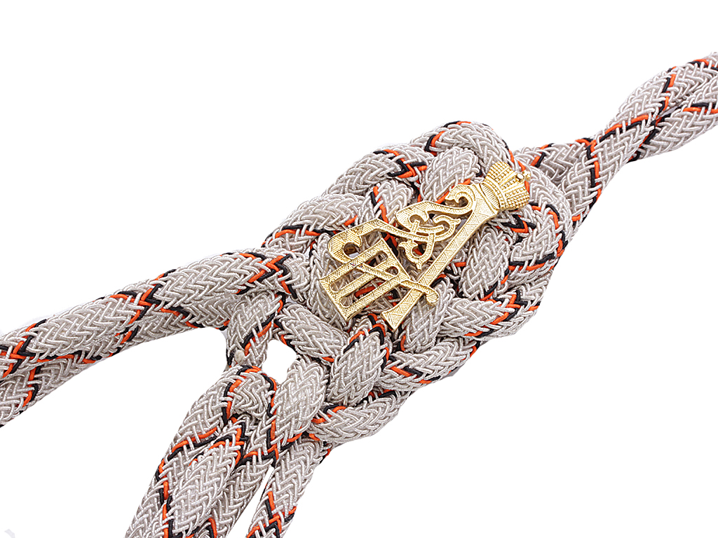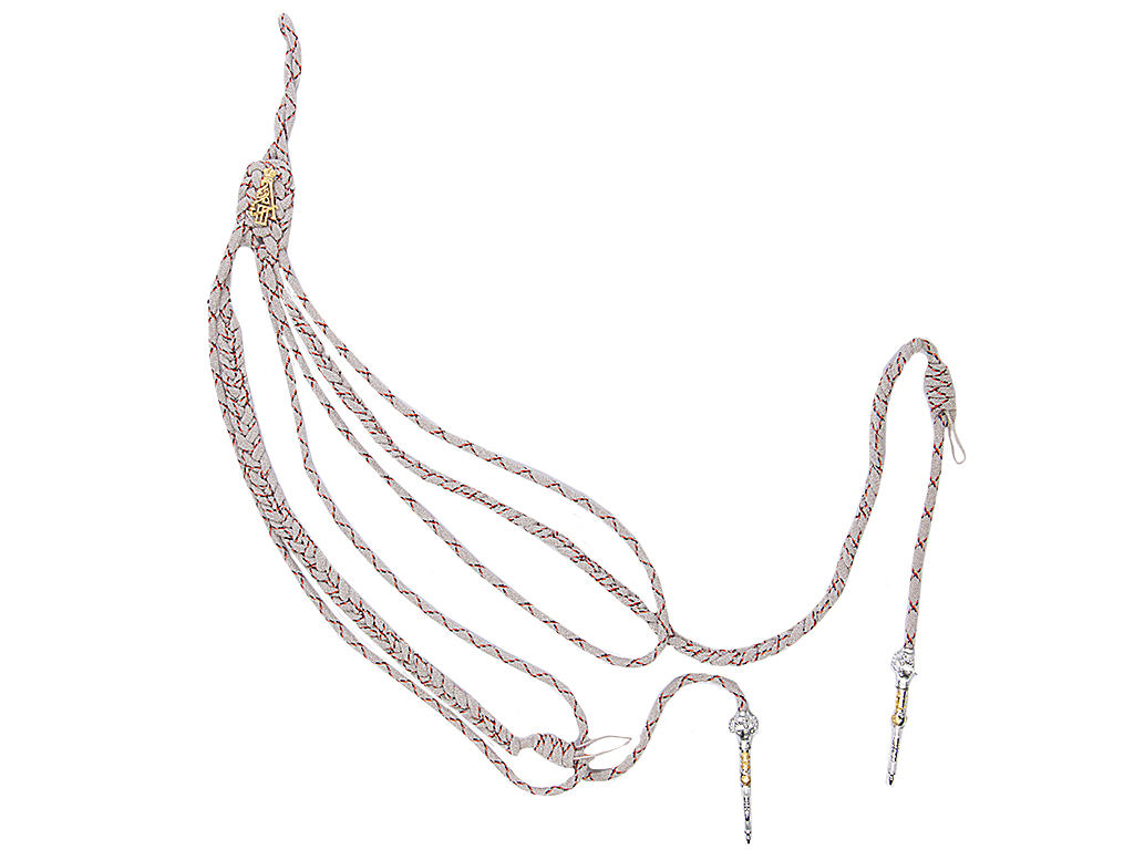 Гусарский адъютантский офицерский аксельбант с накладным вензелем Императора Александра Третьего. Качественная копия, изготовленная из металлизированной серебряной нити с черными и оранжевыми просветами, вензель - позолоченный.