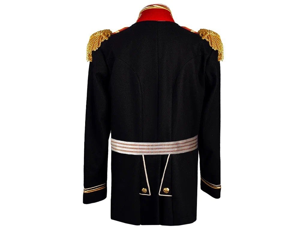 Представлена современная копия указанного мундира. Мундир черного (темно-зеленого) сукна, однобортный с одним рядом пуговиц диаметром 22 мм желтого цвета приборного металла императорского орла наложенного на скрещенные якоря (в 27 сентября 1904 году в ознаменование дня рождения цесаревича Алексея всем чинам флота было дано право носить пуговицы с изображением двуглавого орла). На отношение к свитской форме Морского Ведомства указывает наличие белого канта по борту, обшлагам, вороту и клапанам карманов мундира. Соответствие мундира указанным чинам можно определить по соответствующему шитью обшлагов и ворота. Шитье канителью по алому (красному) сукну. На свитском мундире пристегнуты эполеты, контр-адмирала царской свиты Гвардейского флотского экипажа золотого галуна, красного подбоя. Однако, на них отсутствует императорский вензель желтого цвета (для ГФЭ) приборного металла, в свите которого находился контр-адмирал Гвардейского флотского экипажа (Таб.3.3: ПрВВ 1894 года №253 и №277). Пуговицы диаметром 16 мм желтого цвета приборного металла с изображением двуглавого императорского орла наложенного на скрещенные якоря (в 27 сентября 1904 году в ознаменование дня рождения цесаревича Алексея всем чинам флота было дано право носить пуговицы с изображением двуглавого орла). Адмиралы, генералы и офицеры особо приближенные к императору, с начала XIX века составляли его свиту и имели свитские чины – генерал-адъютант и флигель-адъютант. В 1827 году для военных чинов были установлены особые чины «свиты величества генерал-майор» и «свиты величества контр-адмирал».