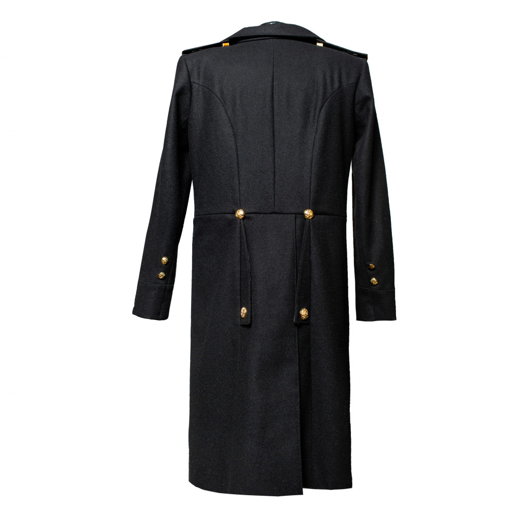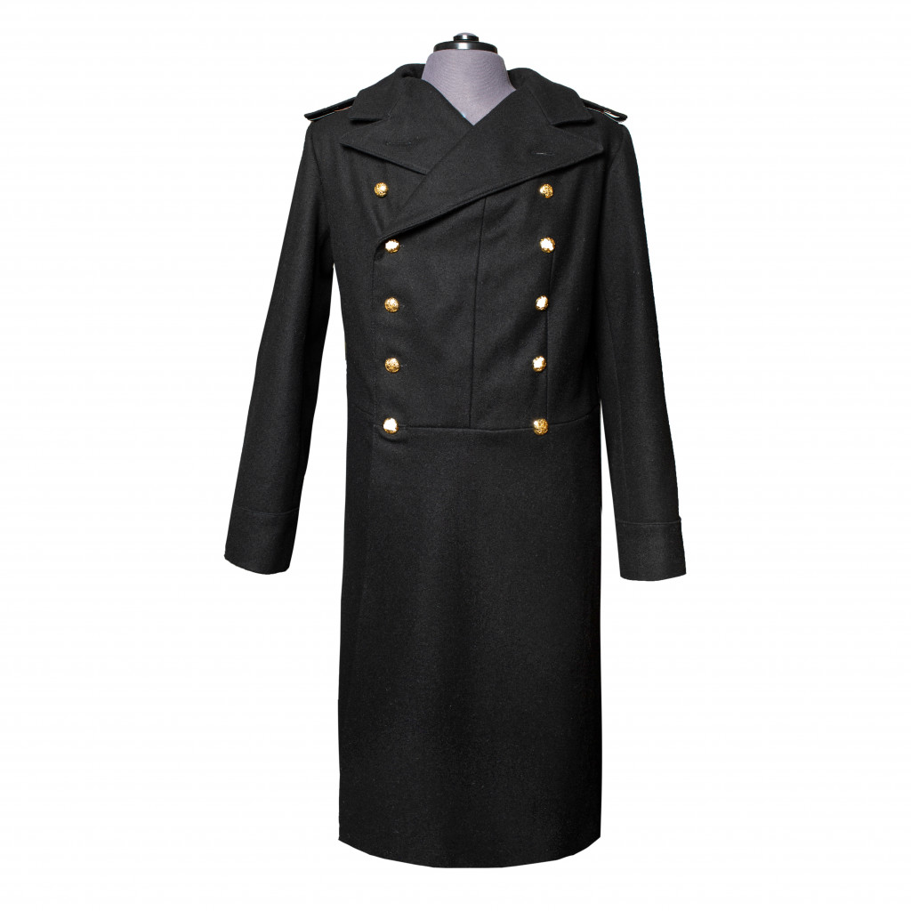 Современная копия сюртука Капитана 2-го ранга Флотского экипажа РИФ. Сюртук черного сукна, двубортный с двумя рядами (по шесть в ряду) пуговиц диаметром 22 мм желтого цвета приборного металла с изображением двуглавого императорского орла наложенного на скрещенные якоря (в 27 сентября 1904 году в ознаменование дня рождения цесаревича Алексея всем чинам флота было дано право носить пуговицы с изображением двуглавого орла) на бортах и сзади на карманных листочках юбки. Воротник отложной. Обшлага прямые. На рукавах сюртука у шва над обшлагами расположены по две пуговицы диаметром 16 мм желтого цвета приборного металла с изображением двуглавого императорского орла наложенного на скрещенные якоря. Подклад сюртука выполнен из шелковой ткани. На сюртук установлены погоны капитана 2-го ранга Флотского экипажа РИФ. Погоны изготовлены из нашитого золотого галуна на подбой черного сукна с установленными пуговицами желтого металла РИФ диаметром 16 мм, и шестью серебряными звездами по три на каждом.