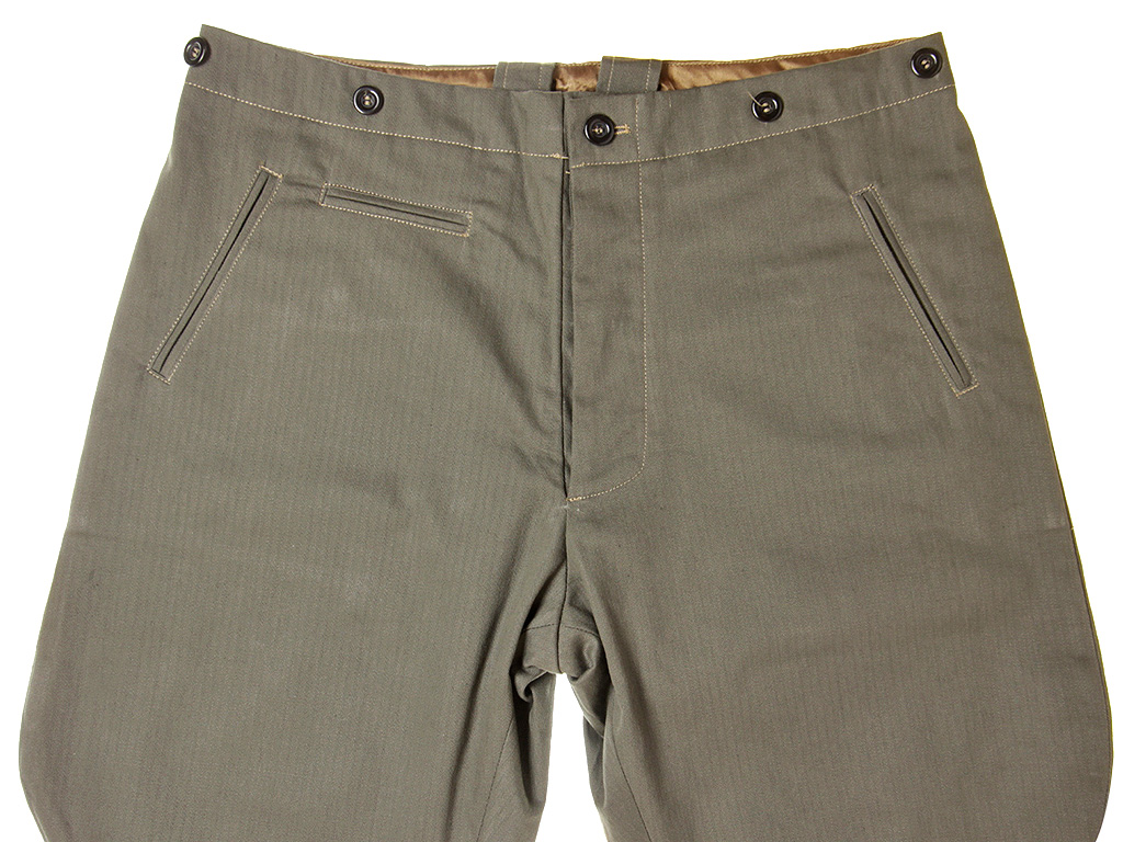 Брюки, обычно носившиеся рядовым составом и унтер-офицерами с форменным кителем, шились из серой ткани. Они были прямого покроя и имели относительно высокую талию. Брюки застегивались спереди на четыре пуговицы, пятая верхняя пуговица располагалась на поясе. Три пары пуговиц для подтяжек находились на поясе - две по сторонам и одна сзади. Позади поясная часть имела небольшой V-образный вырез с коротким матерчатым пояском с металлической пряжкой, который стягивал брюки в талии. Иногда для надежности рядом с пуговицами для подтяжек к поясу пришивались дополнительные пуговицы, роговые, пластмассовые или металлические.