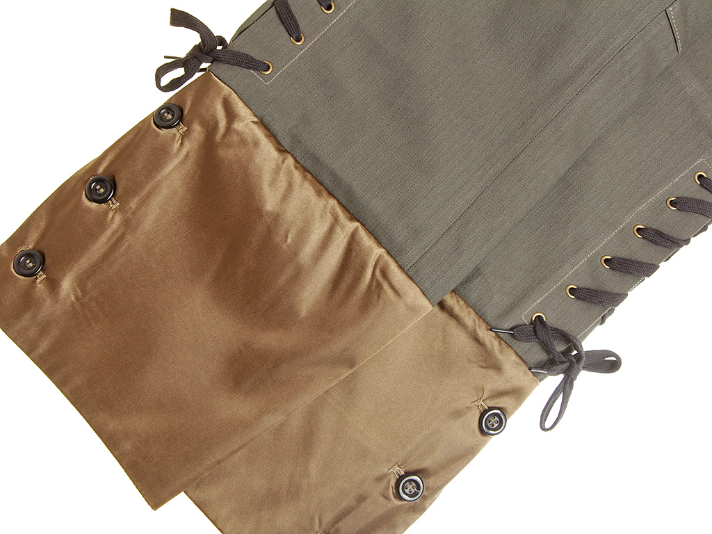 По три обметанных петли для ременных крюков располагались одна над другой спереди и сзади на уровне талии. Четыре съемных металлических крюка могли крепиться на трех разных уровнях для поддержания кожаного пояса и всего висевшего на нем снаряжения.