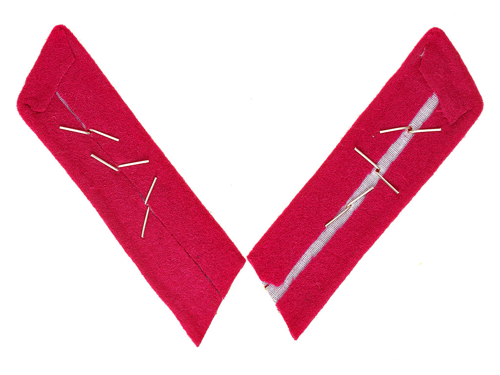 б) Петлицы пошиваются из приборного сукна крапового цвета с малиновым кантом и продольной полосками (посредине) желтого цвета, шириной в 2,5 мм, которые нашиваются одна от другой на расстоянии 7 мм.