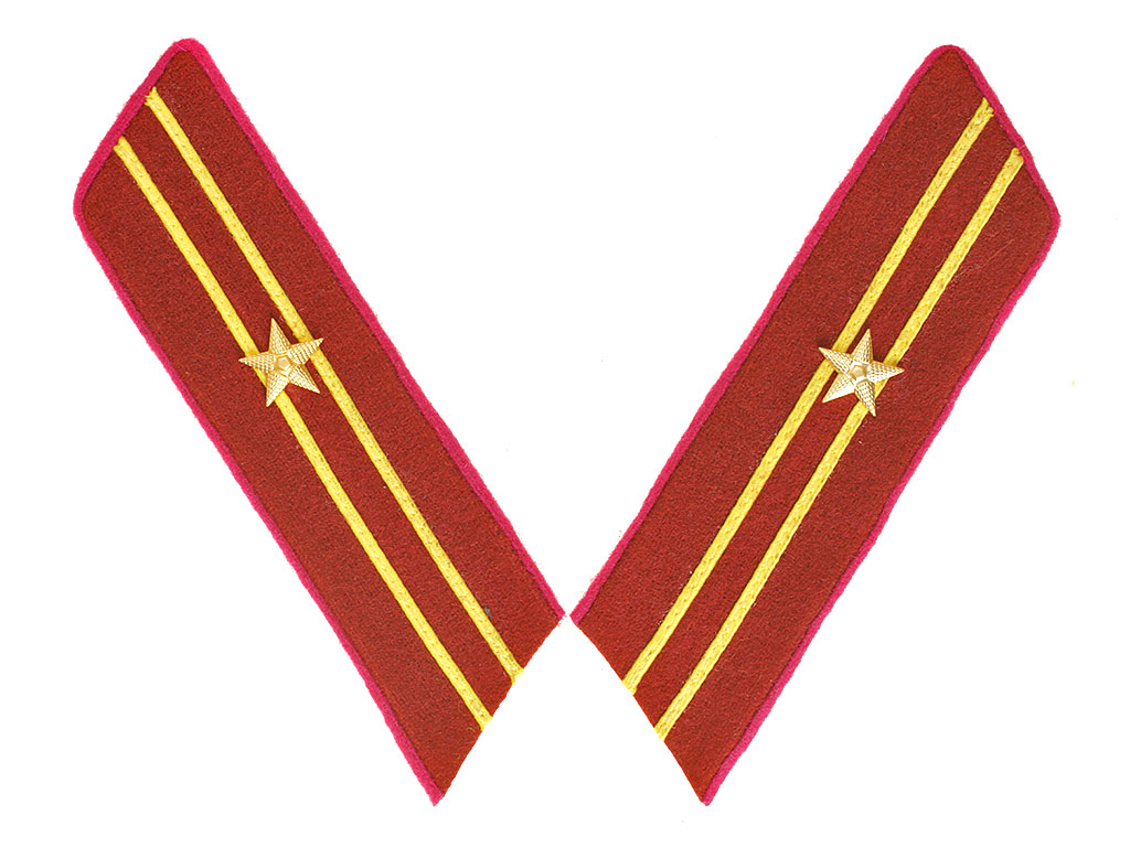 б) Петлицы пошиваются из приборного сукна крапового цвета с малиновым кантом и продольной полосками (посредине) желтого цвета, шириной в 2,5 мм, которые нашиваются одна от другой на расстоянии 7 мм.